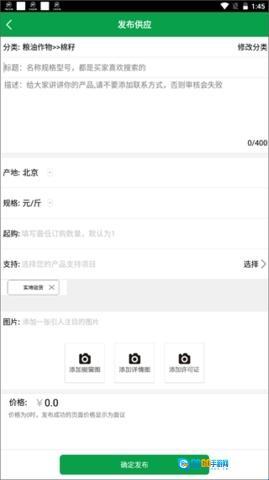5、进入产品发布供应信息页面后,需填写发布页面的相关内容:首先填写标题、描述产品信息,选择产地与规格;接着上传产品主图、详情图,若涉及特种养殖、农药兽药等产品,还需上传相关经营许可证,这些资料有助于提升交易成功率;然后输入价格,若价格填0,供应页面将显示为“面议”;确认所有信息填写完整后,点击“确定发布”。发布成功后会跳转至提交成功页面,此时可选择继续发布新信息;若您已注册并登录账号,可前往个人中心的“我的供应”板块查看已发布的供应信息。