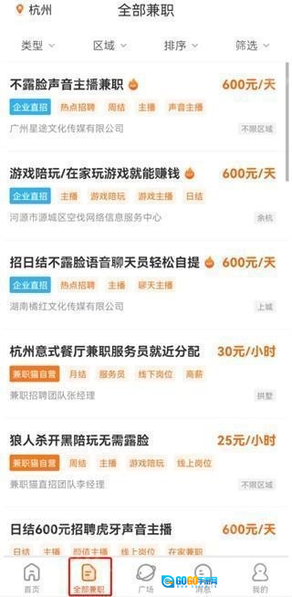 1、双击打开兼职猫软件后,用户可通过点击“全部兼职”选项来筛选合适的兼职信息。