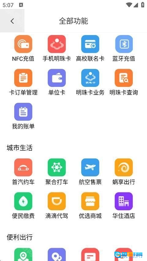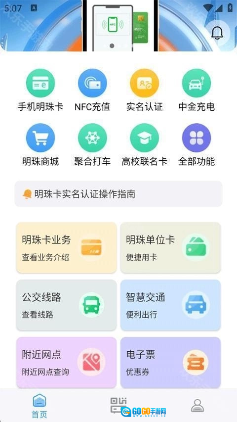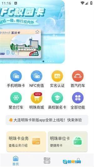 1、打开大连明珠卡应用,其首页整合了NFC、充电、商城、打车、手机明珠卡等丰富多样的生活服务功能。