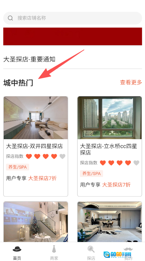 1、启动大圣探店应用进入首页,点击“城中热门”板块,即可查看探店信息列表。
