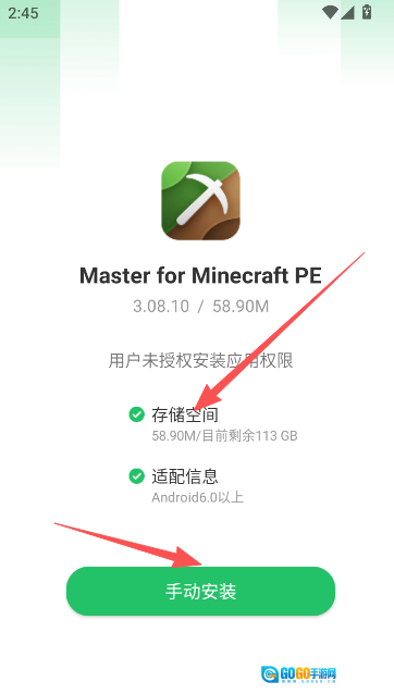 1、授权应用更新管理权限,点击手动安装。