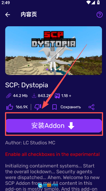 7、取得资格后,点击安装Addon,接着将其导入你的游戏世界,你可以选择单人游玩,也可以和其他玩家一同在线体验。