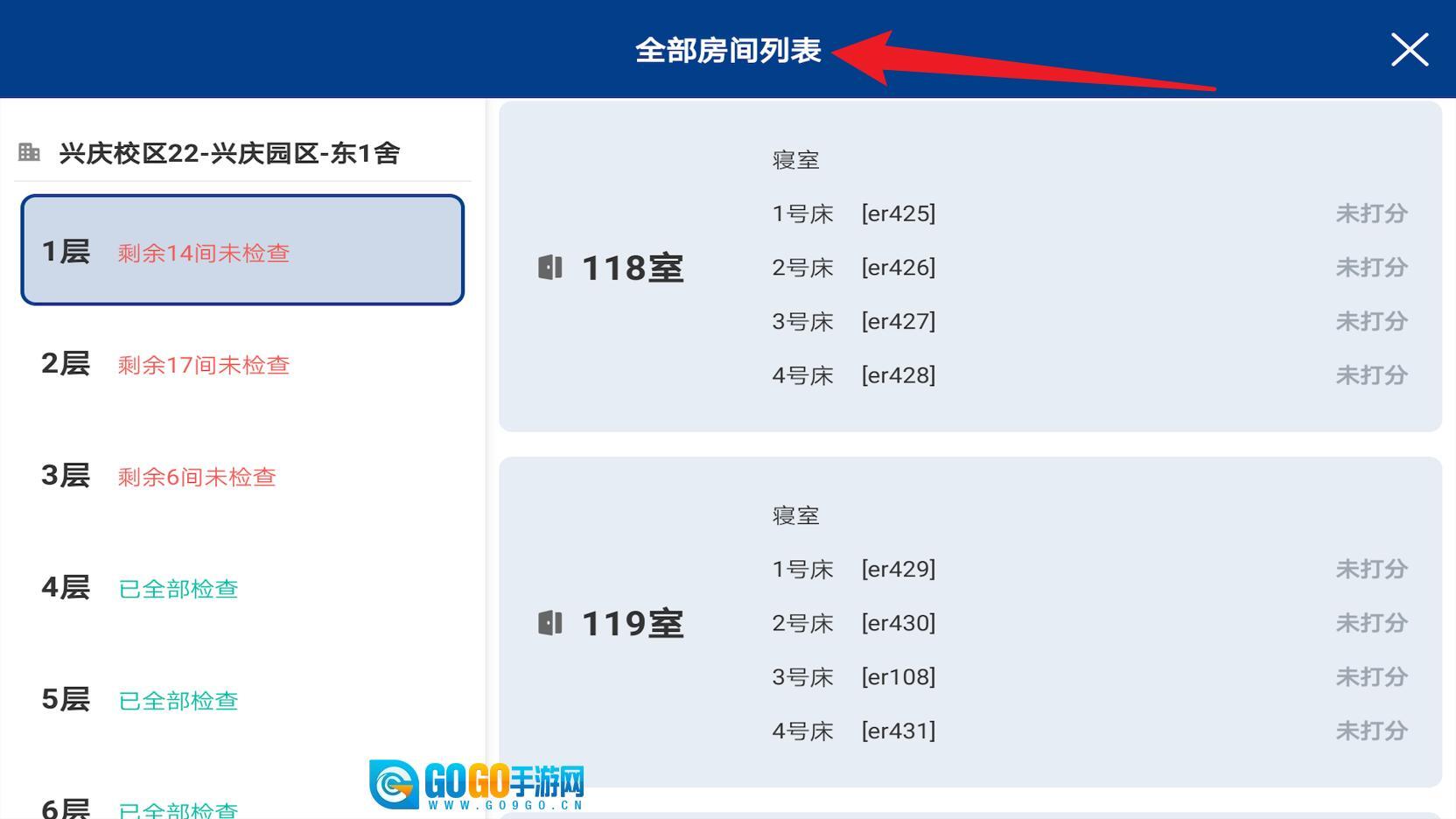 3、点击全部房间列表,就能进入具体的宿舍楼层与房间详情页面,这里会显示房间处于未检查或已检查的状态,便于管理人员高效把控查寝进度。