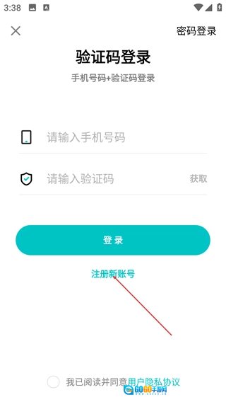 3、在【验证码登录】界面,可填写手机号与验证码登录,若未注册则点击【注册新账号】进入注册流程。
