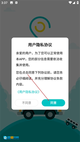 1、打开应用后,弹出【用户隐私协议】提示,阅读条款内容后点击【同意】按钮,即可进入应用后续界面。