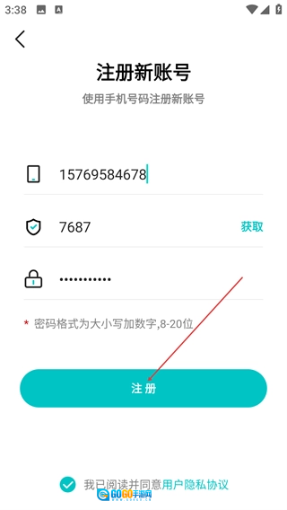 4、在【注册新账号】界面,填写手机号、获取并输入验证码、设置符合要求的密码,勾选协议后点击【注册】完成账号注册。