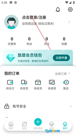 2、进入“我的”页面,点击顶部【点击登录/注册】区域,可进入登录相关界面,同时能查看订单、账号安全等功能入口。