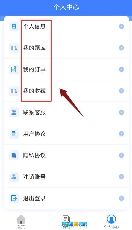4、个人中心可查看个人信息、我的题库、订单记录与收藏夹。