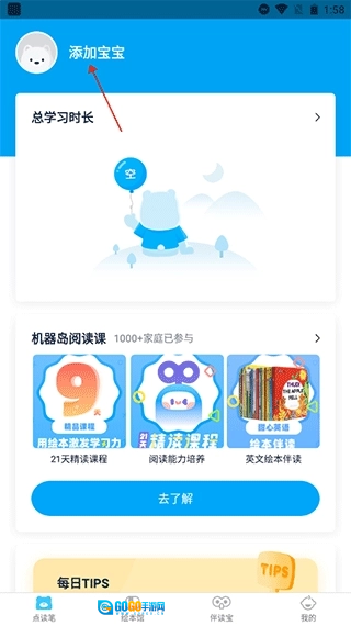 1、软件注册登录完成后,进入点读笔页面,点击左上角的“添加宝宝”按钮。