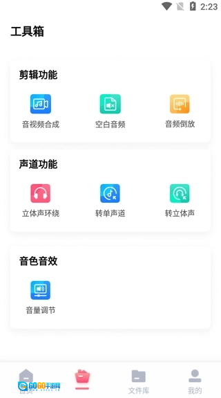 2、此外还具备工具箱功能,可支持音视频合成、空白音频生成、音频倒放、立体声环绕效果制作、音量调节等操作;
