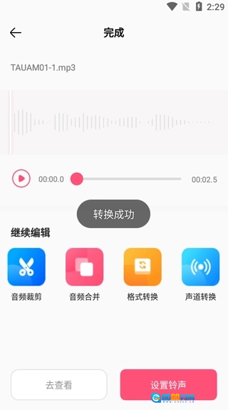 5、音频转换成功后,你就能对它进行裁剪、合并、格式转换等处理,也可以将其设置成铃声。