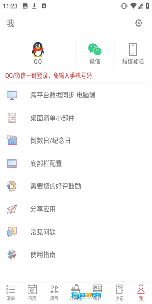 点击右下角的“我的”,就能查看各类功能,包括桌面清单、倒数日、底部栏配置等。