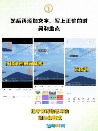 用美图秀秀的消除笔去除照片上的时间,接着添加文字,标注正确的时间与地点。
