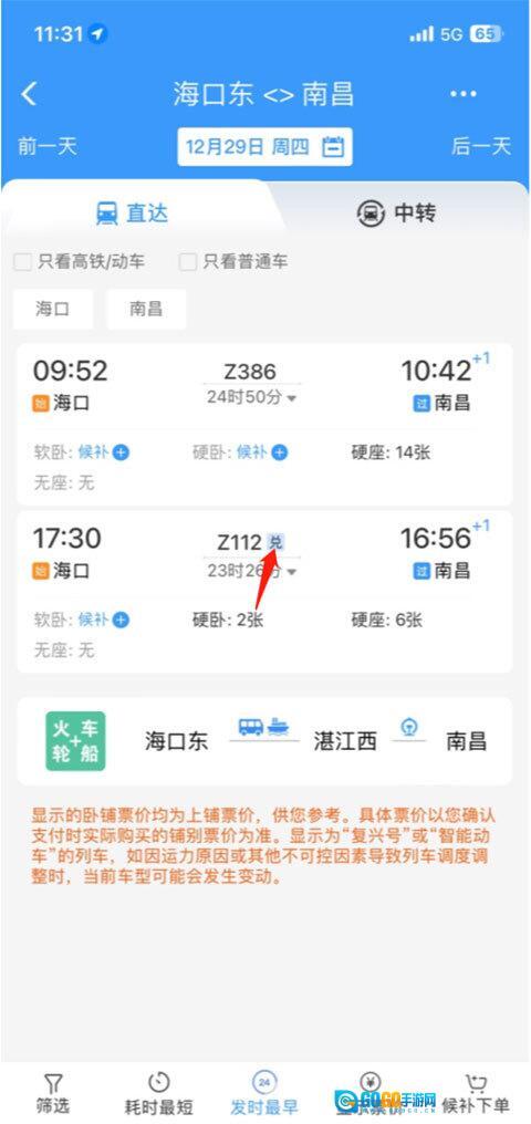 确定好目的地后,点击搜索,选择带有“兑”字标识的车次。(也可以在左下方的筛选栏中勾选“可兑换车次”选项)