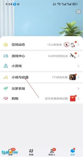 打开软件后,进入动态页面,能看到空间动态等功能入口,接着点击小说与动漫选项,即可进入小说页面。