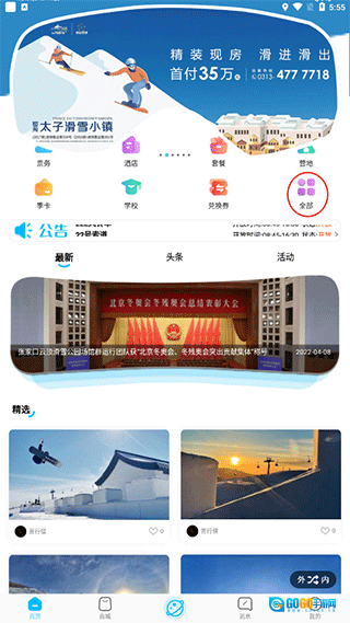 1、进入云顶滑雪公园,账号登录成功后,进入首页,点击上方的“全部”按钮进入。