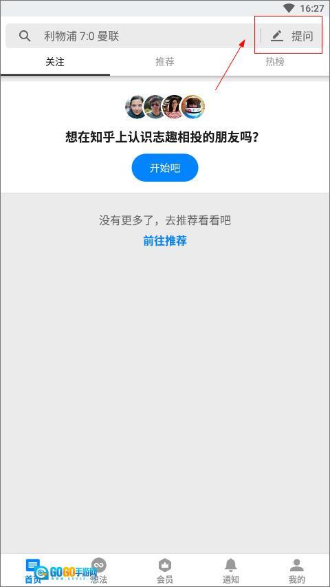 1、打开知乎,在首页点击右上角“提问”;