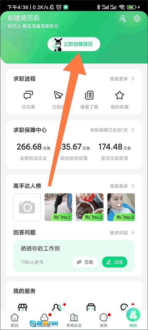 1、打开赶集网,点击页面底部的“我的”进入个人中心,接着点击顶部的“立即创建简历”按钮。