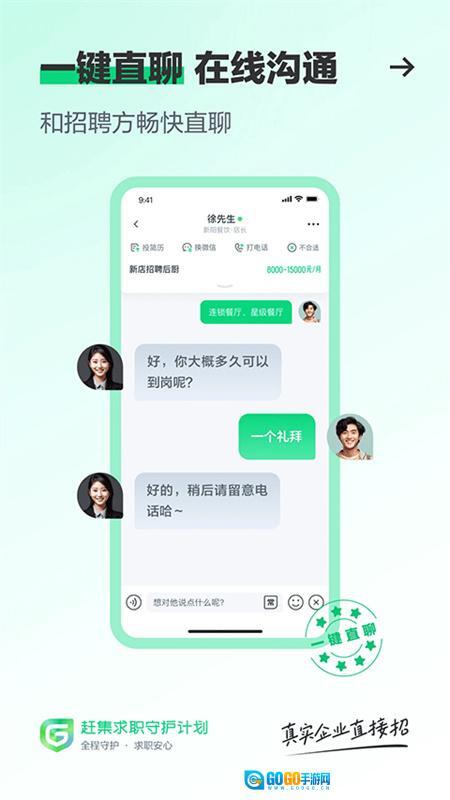1、【聊天式求职】如同微信聊天般轻松,直接和主管在线沟通,聊得投缘就能上岗,最快一小时完成入职流程;
