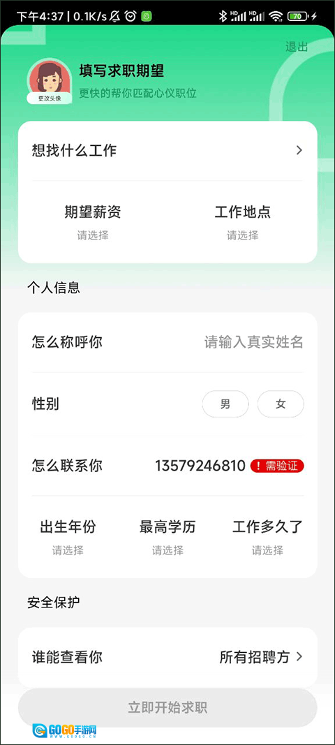 2、然后填写相应的资料然后点击立即开始求职。