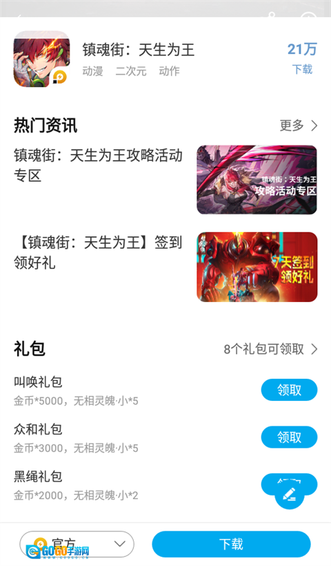 2、进入该游戏的详情页面后,找到下方“礼包”按钮,点击其旁边的【领取】按钮,就能完成领取操作。