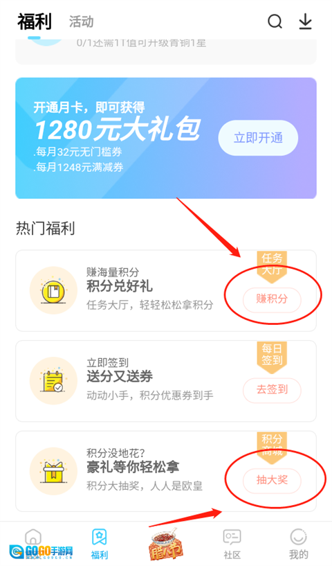 1、进入【福利】页面后,选择点击【赚积分】或者【抽大奖】这两个选项之一;