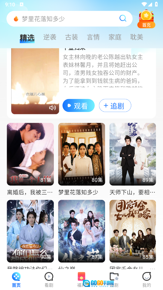 打开软件后,首页呈现出详尽的短剧资源分类,涵盖逆袭、古装、言情等多种类型,用户也能借助页面上方的关键词搜索功能查找所需内容。