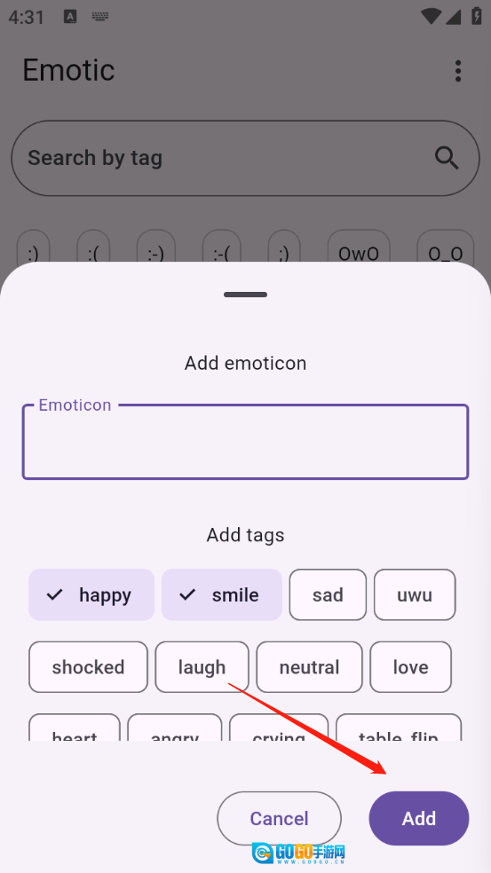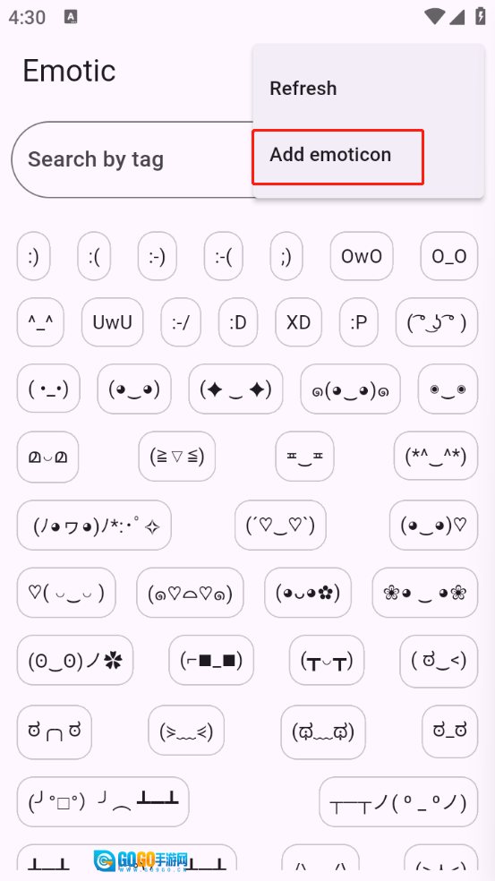 点击右上角的三点图标,然后选择“add emoticon”选项。