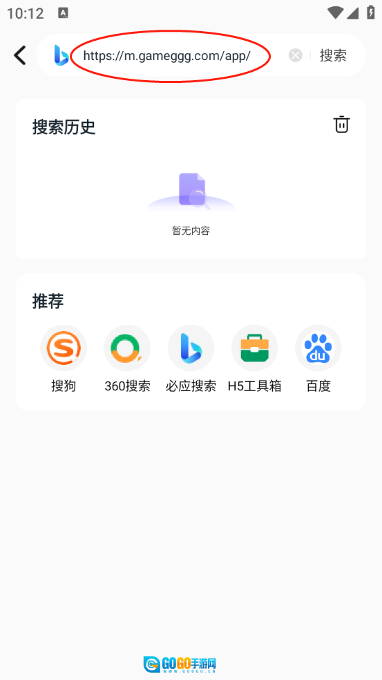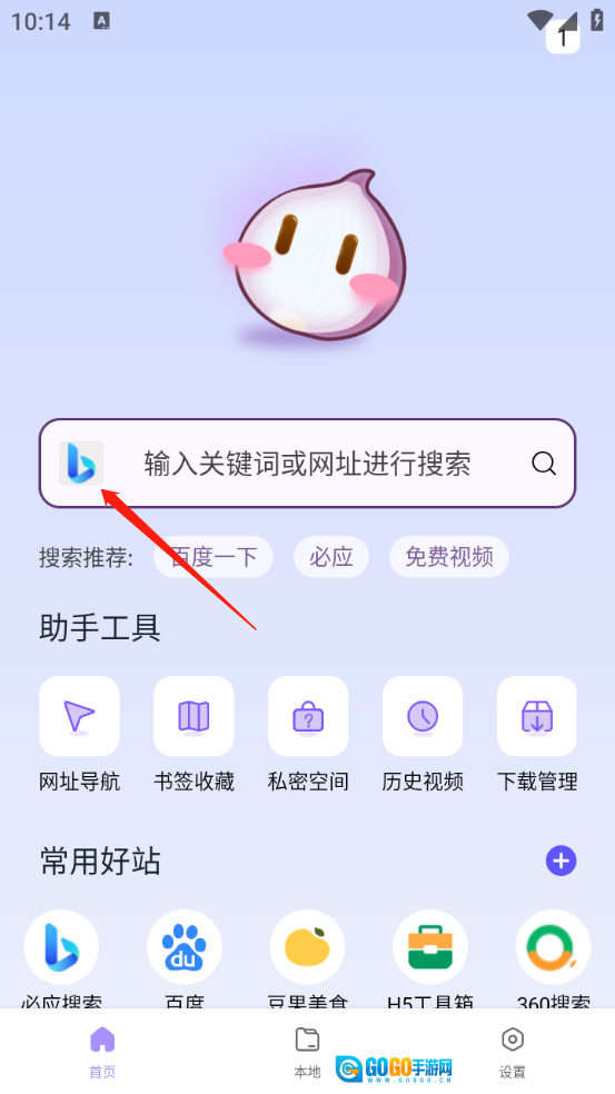 进入首页后,点击图中所指的位置就能切换浏览器,系统默认的是必应搜索。