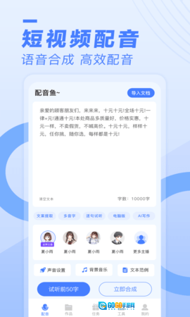 配音鱼是一款功能强大且操作简单的文字转语音配音软件,它具备海量广告模板和高品质AI合成配音主播发音人,能够满足各类配音需求。同时,配音鱼还提供了批量生成配音、导出配音文件、分享至社交媒体等实用功能,助力您更高效地管理与运用配音资源。无论您是个人用户还是企业用户,都可以通过配音鱼制作出优质的配音作品,无论是广告配音、新媒体短视频配音,还是有声阅读、铃声制作等场景,配音鱼都能为您提供支持。