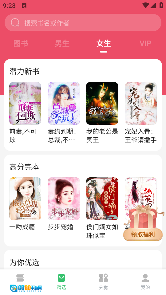 点击“精选”板块,就能看到丰富的小说分类,涵盖男生向和女生向作品。