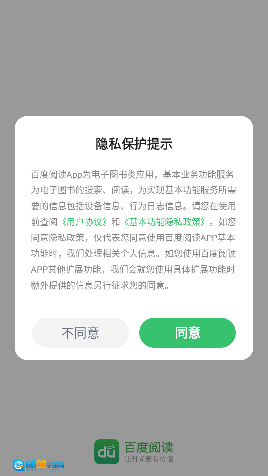 安装百度阅读后将其打开,在同意相关政策与协议后再次打开。