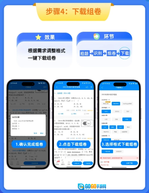 4、完成组卷相关设置并确认无误后,点击“组卷”按钮,即可根据实际需求选择不同格式一键生成试卷,操作便捷高效。