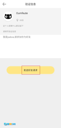 3.在“验证信息”页面,用户点击“发送好友请求”后,需待对方同意,双方才能成为好友。