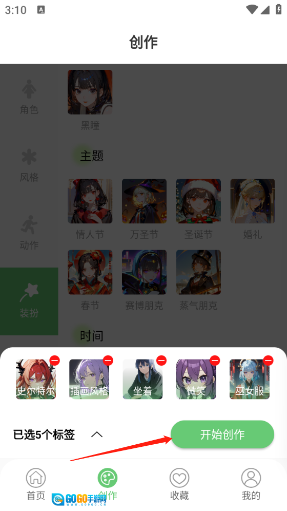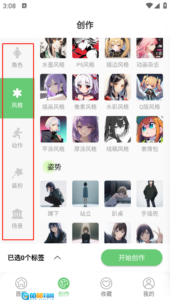 在左侧栏目里,能够选择角色、风格,还有动作、装扮之类的标签。