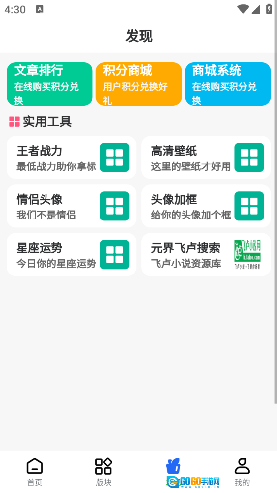 “发现”页面汇集了众多实用工具,像高清壁纸、网址战力、星座运势等,用户直接点击就能使用。