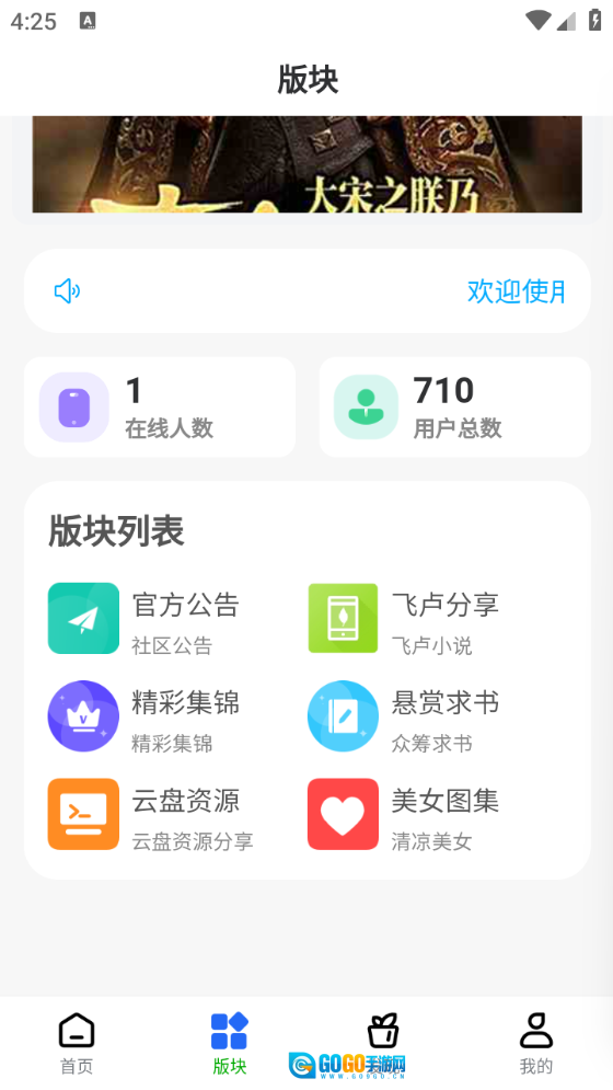 “板块”页面,有美图、云盘资源以及小说资源分享。