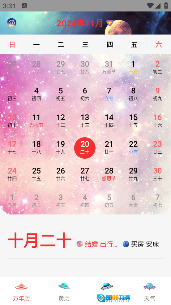 进入首页后,首页的万年历页面会为用户呈现详细的日历信息。