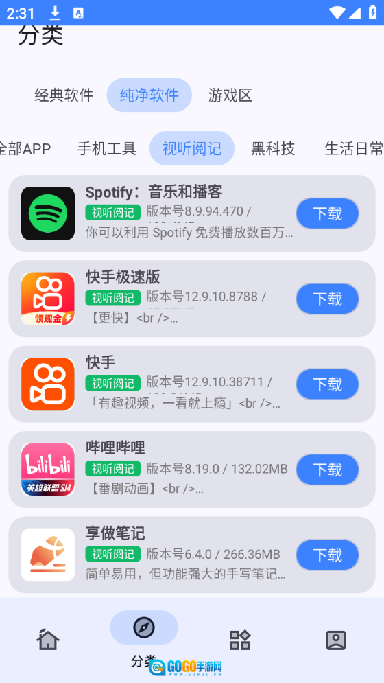 “分类”页面把应用做了细致的分类,影视、小说漫画这些类别都包含在内。