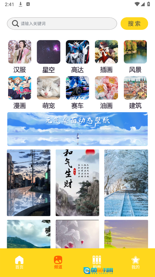 在“频道”板块中,用户可以找到动态壁纸资源,这里汇集了汉服、星空、油画等多种不同类型的壁纸分类。