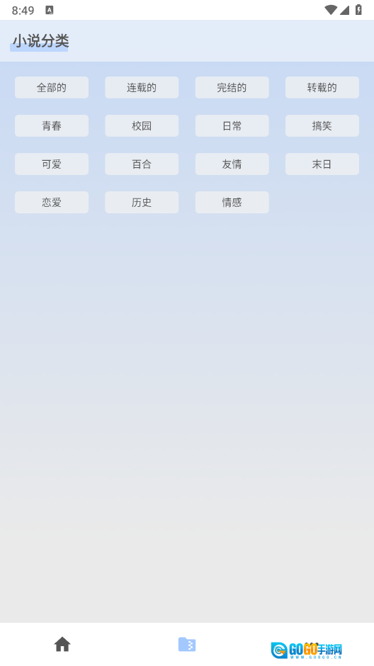 点击“小说分类”板块,就能看到丰富的小说资源分类,涵盖日常、校园、可爱恋爱等多种题材。
