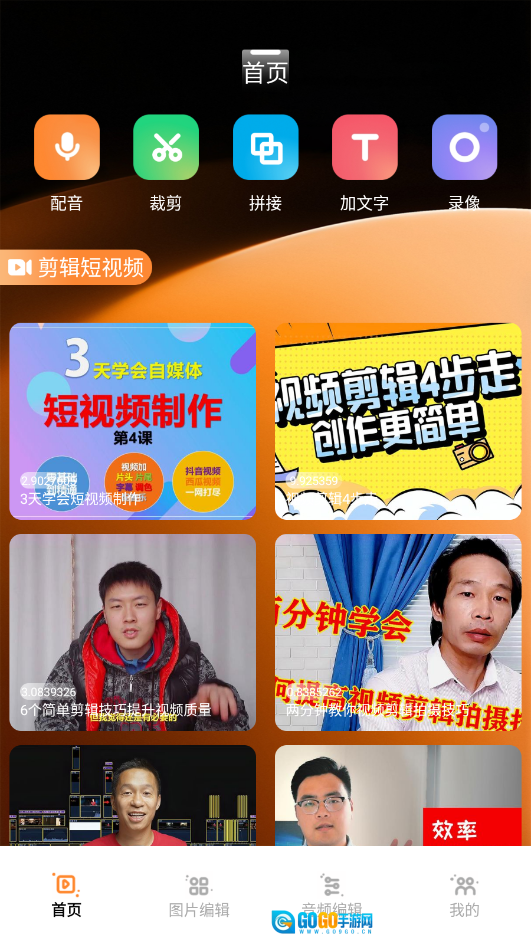 打开软件后,首页提供了丰富的视频剪辑工具与模板,涵盖配音、裁剪、添加文字等功能。