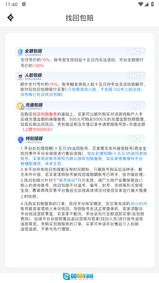 支付号价的10%,若账号遭遇找回且十五日内未能追回,平台将按号价的100%进行全额赔付!