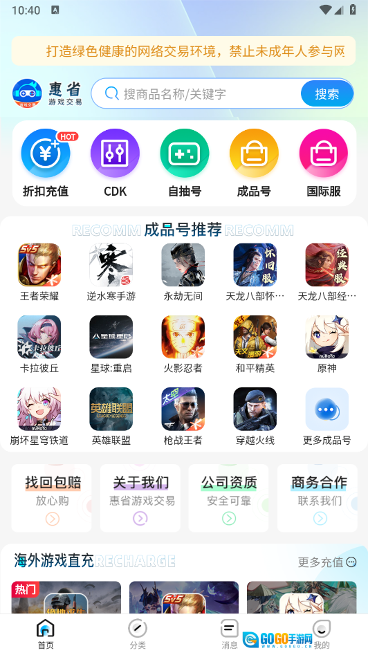惠省折上折是一款专门为游戏玩家设计的游戏交易工具,这里汇聚了各大知名游戏的账号交易资源。每一个账号都要经过平台严格的审核与筛选才能发布,让您交易时超级安心。此外,平台价格公开透明,能确保整个交易过程安全可靠,各位游戏玩家快来这里发现优质的游戏账号吧。