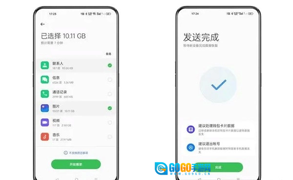 连接成功后,你可以选择把当前手机的全部内容转移到新手机上,也能自行选择要迁移的数据,之后点击“开始搬家”按钮就可以了。