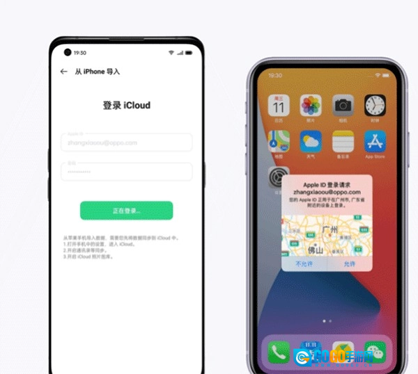 当苹果手机弹出iCloud账号登录请求的窗口时,点击“允许”选项,接着在新的OPPO手机上输入iCloud对应的验证码,就能完成连接操作了。