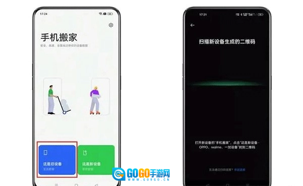 打开旧手机,进入相关界面后选择“这是旧设备”,此时会弹出扫码界面,接着使用旧手机扫描新手机上显示的二维码即可。