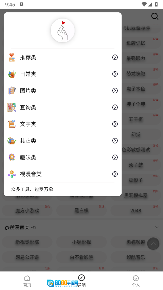在“导航”板块里,整合了众多资源板块,点击左上角的三条横线图标,就能看到日常类、图片类、影视动漫类等分类。