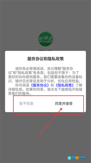 在【带动美】的【服务协议和隐私政策】弹窗里,点击【同意并接受】按钮就能进入软件,要是选择【暂不同意】的话,就没办法使用服务了。