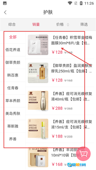 进入【护肤】分类页面后,你可以按照【销量】或者【价格】对商品进行排序,还能选择品牌分类,点击对应的商品就能进入详情页。